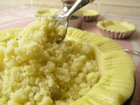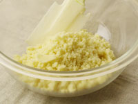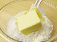 6.出来上がったぽろぽろの生地をひとかたまりにしないで、そぼろ状のまま冷蔵庫で冷やします。30分くらい冷やすと生地が安定しますので、そのまま使用するまでねかせておきます。2〜3日の間なら冷蔵庫で、それ以上置くようでしたら冷凍庫で保存してください。