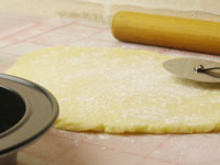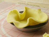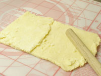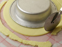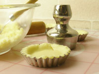 10.いよいよ生地を伸ばします。打ち粉は強力粉です。薄力粉に比べて粒子がさらさらなので生地に入り込みにくく、生地の仕上がりが良いです。余分な打ち粉を落とす場合にも、刷毛で落とすやすいです。さて台の上に軽く打ち粉をふり生地をおきます。最初は麺棒を転がすのでなく、上からギューと押す感じで倍くらいの大きさになるまで押しながら大きくします。次に打ち粉をふり、麺棒に体重をかけて大きく伸ばしていきます。大きく伸ばしたら、生地を三つ折にたたみ、また伸ばします。もう一度三つ折にたたんだら大きな丸形に伸ばします。パイ皿よりひとまわり大きめにカットし、パイ皿に敷きこみます。残った生地はもう一度丸め直し、直径7.5センチのタルトレット型(マドレーヌ型でも良いです)を3個取ります。タルトタンバーでギューと押し付けると、簡単にタルトレット型に生地が押し付けられます。大きなパイ皿でも小さめのパイ皿でも、両面使えるタルトタンバーはなかなか有効的に使えます。タルトタンバーの代わりに、指先を使っても同様のことはできますが、生地に体温が伝わるのを防ぐことができます。指先が温かい方にはお奨めです!
