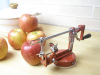 ●リンゴの皮むきはクルクル簡単に!ぶきっちょなアメリカ人でなくてもあると嬉しいリンゴの皮むき器。プラスしてスライスまでできちゃう、この優れもののお陰で今年の秋はリンゴにはまっています。何はともあれハンドルをグルグル回してリンゴのスライスからはじめます。リンゴは水分がたっぷり含まれていますから、お砂糖とレモン汁をだけで煮ていきます。弱火でコトコト煮るのは焦がさないため。あたり一面リンゴの甘い香りに包まれます。ついついクルクルやり過ぎて、冷蔵庫のリンゴを全部、皮むき&スライスしないように気をつけましょう。と申しますのも、あまりに簡単に皮むきとスライスができるものですから・・・・・ご忠告を含め念のため、お伝えしておきます。(調子にのってやり過ぎてしまった私がいうのですから・・・)