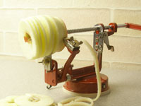 1.リンゴはアップルピーラーにセットし、グルグル回転させて皮を剥きながらスライスをしていきます。芯の部分もくり抜けますから、らせん状にスライスできたら縦半分にカットします。ここまではアッという間の出来事です。(包丁でカットする場合は皮を剥き、たてに4分の1にカット。厚さ3〜4ミリの小口切り)