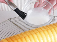 6.完全にさめたらトッピングをします。マンゴジャムを小匙一杯の水で溶き、ゆるくしたところで刷毛で表面全体に塗ります。そのまましばらく置いておきましょう。生地にマンゴジャムが馴染むまで待ちます。