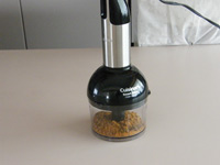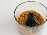 4.冷めるとカチンカチンになります。冷めたら手で簡単に適当な大きさに割って、ブレンダーのボトルに入れ、細かく砕いて出来上がりです。マシーンを使わずに砕く方法はさらしの布(手ぬぐい)を広げてカチンカチンのプラリネを置きます。さらしの布をたたみプラリネを包みます。すりこ木や麺棒の先でたたいて細かく砕きます。またはすり鉢にプラリネを入れすりこ木でたたく方法もあります。