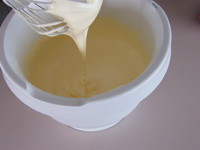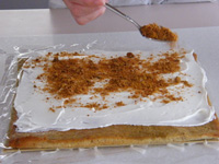 初めて作るときはお鍋の砂糖液が焦げてきたときにあわてないことです。焦げてきたらお鍋を固定せずに大きく回して全体に均一のカラメルの色を付けます。火からはずしてアーモンドスライスを加え、しっかりとアーモンドスライスに絡めます。ちゃんと焦がしてカラメルを作っておかないと本来のカラメルの味になりませんが、どの程度焦がしたらよいか少しわかりにくいかもしれません。プリンにかかっているあのカラメルソースの色をイメージしてカラメル作りをしてみてください。