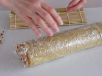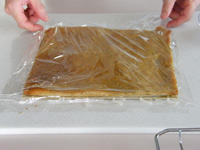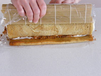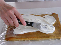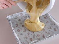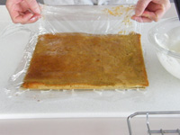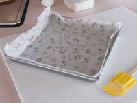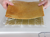 ※ 型の準備をしておきます。グラシン紙をロールケーキ型にピチっと敷き込んでおきます。