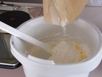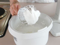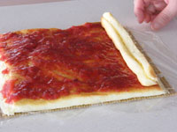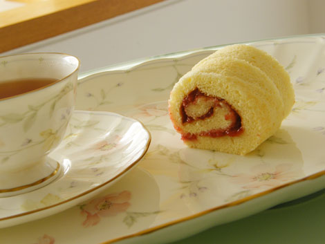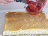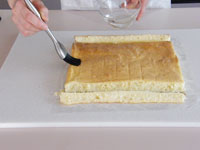 10.シロップをたっぷり塗り、イチゴジャムを広げます。手前に芯棒を置き、ぴっちりと巻いていきます。クルクル巻くコツはピチっと巻くこと!!