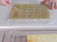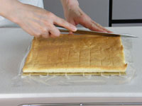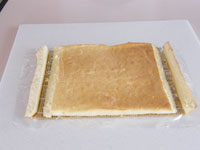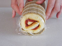 11、巻き終わったらラップでくるみ冷蔵庫で30分以上寝かせ完成です。カットするときは庖丁の刃をぬるま湯で濡らしながらカットすると、切り口がきれいにスライスできます。