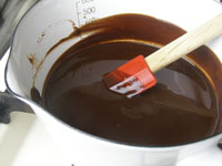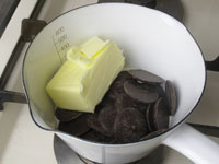 1.お鍋にチョコレート・バター・生クリームを入れ弱火にかけます。チョコレートがとけ、全体が均一になじんだら火からおろしておきます。