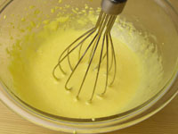 2.卵黄をボウルに入れ40度の湯せんで少し温めます。温めることで砂糖が溶けやすくなるからです。ハンドミキサーで卵黄をミキシングします。そこへ砂糖の半量(55グラム)を入れ、黄身の色が白っぽくもったりするまでしっかり泡立てます。卵黄に砂糖を加えるときに大事なのは、砂糖を加えたらすぐに泡立てることです。卵黄は水分を吸ってしまう性質があり、砂糖を入れてそのまま放っておくとブツブツになってしまいます。砂糖を加えたらすぐに泡立てて均一にしましょう。