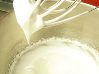 4.次にデロンギの「パティシエ」でメレンゲを作ります。ボウルに卵白をいれ、1分ほど泡立てたところで砂糖を加え、さらにしっかりと泡立てます。ピンと角がたつまでしっかりミキシングしましょう。卵白の泡立てで一番大事なことは、まずボールとホイッパーに油分や水気がないこと、また初めはまず卵白だけで泡立てます。そのあと砂糖を加えます。決してはじめから砂糖を入れないでください。きれいなつやのあるメレンゲが出来ましたか?(ガトー・ショコラはこの卵白のあわ立てが、出来具合いにかかわってきます。)