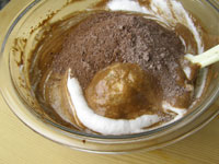 6.そこへ、よくふるってある(2回はふるっておきます)小麦粉とココアをいれ、混ぜていきます。この時にメレンゲの白っぽい部分も全体になじんできます。メレンゲの泡をつぶさないように、でも粉気が完全になくなるまで、上手に粉合わせします。