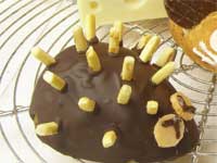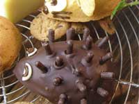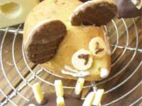 6.仕上げをしましょう。チョコレートは湯せんにかけて溶かします。溶かしたチョコレートを回しかけ、固まるまえに短くカットしたポッキーを刺せば、ハリネズミの完成です。耳のおおきなねずみ君も場合も、クッラカーを耳の位置にチョコレートが固まるまえにくっ付けて仕上げます。