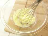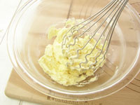 1.室温に戻し柔らかくしたバターをボウルに入れ、白っぽくなるまで泡だて器で攪拌します。今回は量が少な
