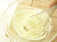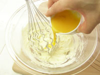 3.次に分量の卵を少しずつ加えながらさらにミキシングします。大事なことは少しずつ加えることと、卵液が冷たくないこと。卵は常温(真冬なら人肌程度に湯せんした卵を使用するのが良いです)しっかりミキシングし