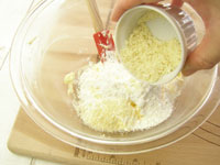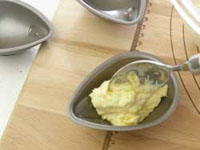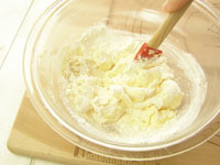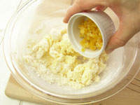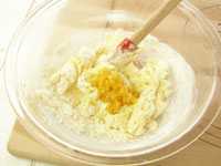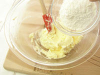 4.泡だて器はここまでです。今度はスパチュラを持って粉合わせしましょう。ふるった薄力粉とアーモンドプードルを加えて粉合わせします。粉気が少し残っているくらいのところで、刻んだオレンジピールを加え全体を馴染ませたら生地の完成です。