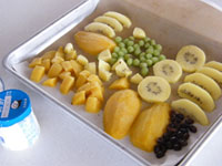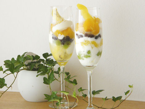 材料 缶詰のマンゴ ゴールデンキウイ デラウエア ぬれ甘納豆 ヨーグルト |