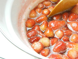 赤いシロップを半分に煮詰めて取り出しておいたイチゴに回しかければ出来上がり!!