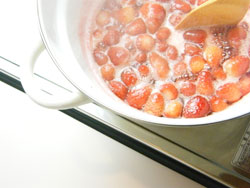 こんなときはホーローのお鍋の出番です。弱火でトロトロ・・・トロトロ・・・ 全体に火がまわってイチゴがちょっとだけふにゃっとしてきたら、穴あきお玉でイチゴだけすくいます。