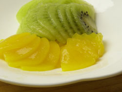 今日のところはキウィと缶詰の黄桃で薄切りに挑戦しました。ストロベリー用ですから用意したキウィと缶詰の黄桃は、厚みと幅を小さくしてからカットしてみてください。