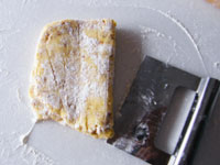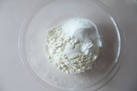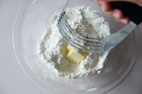 1.ボウルに薄力粉、塩、ベーキングパウダー、グラニュー糖を入れ軽くかき混ぜます。その上に冷たいバターをのせこのバターをカットしながら全体に馴染ませる。
