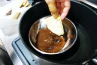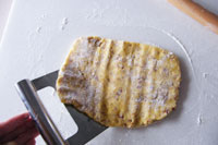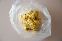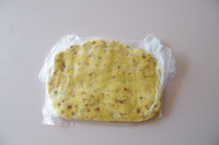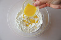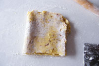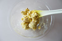 2.粉類とバターが適度に馴染んだら卵1個+牛乳を溶いた液を加え全体を混ぜます。最後に砕いたアーモンドを加え平たく伸ばし、ビニール袋に入れ冷蔵庫で1時間生地を休ませます。