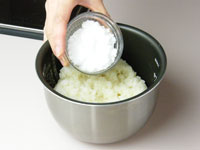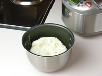 2.炊飯器に準備したもち米を入れます。分量の水を入れて炊きます。炊飯器におこわのメモリがある場合はそのメモリの水分を入れましょう。メモリのない炊飯器の場合はいつも炊く白米に比べ2割水を減らします。炊き上がったら10蒸らします。