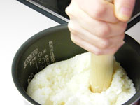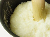 3.炊いたもち米に砂糖と塩を加え、すりこ木でペッタン!ペッタン!つきます。お米の粒が少し残っているくらいが良いです。