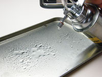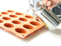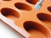 4.型の準備です。シリコン製のオーバル型16取りの内側に霧吹きを使って霧をふいておきます。霧をふくことでもち米が取り出しやすくなります。もち米がまだ温かいうちに型にギューと入れます。