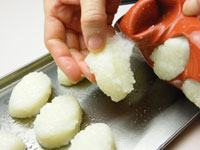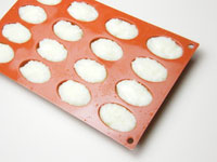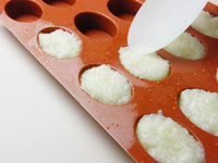 シリコン製のオーバル型16取りは、ケーキ型としてもサイズが小さめで大のお気に入り!今回はケーキ型ではなく、ぺたぺたと手にくっつき易いもち米をこの「オーバル型16取り」にギューと詰め込んで形を作ってしまいます。大事なことはシリコン型の内側に霧をふいておくこと。こうするともち米が取り出しやすく、形を保てます。