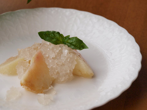 7.仕上げはこんな感じです。プレートに「4」の冷やした桃を並べます。そこへ「6」の砕いたゼリーをたっぷりトッピングします。ひんやりフルーティー贅沢桃の出来上がりです。