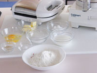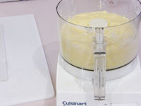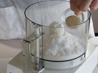 1.クイジナートのワークボウルに羽(ドゥブレード)をセットします。そこへ強力粉・砂糖・塩・ドライイーストを入れて、スプーンの先などで、全体を混ぜます。次に柔らかくしたバター・卵・牛乳を加えながら、ミキシングします。