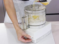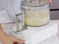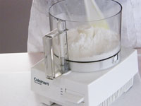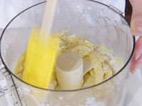 2.初めは2秒ずつ「ダダッ、ダダッ、」と5回ミキシング。ここで蓋をはずしてスパチュラで、側面に飛び散った粉やバターをきれいにおとして、再び蓋をして一気に20秒ミキシングします。