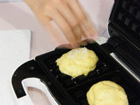 6.温まったワッフルメーカーに、生地をおいて、ギュッと蓋をします。最初の2分は蓋を開けてはいけません。4分たったら様子を見てください。きつね色になっていればOKです。焼き色が薄かったら、あと1分ほど様子を見ながら焼いてください。