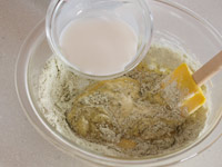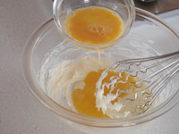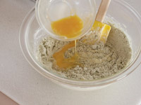 2.次に溶きほぐした卵をすこしずつ加え、その都度ミキシングし卵を馴染ませます。卵を半量ほど加えたら、ふるっておいたホットケーキミックスと抹茶を全量加えます。