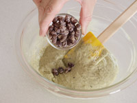 3.スパチュラで合わせながら、残りの卵と牛乳20CCを加えさらに馴染ませます。粉気がほとんどなくなったら甘納豆を加え、全体が均一になるよう軽く混ぜ合わせます。これで生地は完成です。