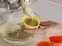 4.スプーンですくいシリコン型6個に等分に入れたら、180度のオーブンで12分焼きます。ケーキテスターで刺してみて火が通っていたらOKです。網の上であら熱を取ります。