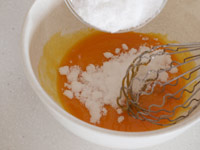 2.まずボウルに卵黄を取り、砂糖の3分の1を入れ攪拌します。このとき卵を湯せんしながらミキシングすると良いです。濃い黄色から徐々に色が薄くなり、もったりしてきます。完全に砂糖が溶け、とろーりしてきたらOKです。