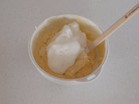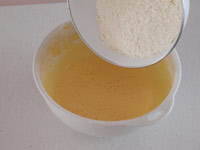 4.「2」のもったりした卵黄にふるった昭和のてんぷら粉と「3」のメレンゲの3分の1を加え、スパチュラで粉合わせをします。