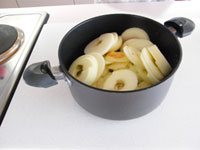 2.直径21センチ以上のお鍋を用意して、スライスしたリンゴと砂糖、レモン汁を加えます。