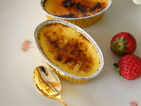 材料(プリン型6〜8個分) 卵 3個 砂糖 90グラム 牛乳 380CC バニラエッセンス 2〜3滴 グラニュー糖 適量(仕上げのバーナーで炙る用) |