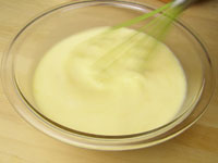 3.ボウルに卵を割りほぐしホイッパーで切るように卵をおおざっぱにほぐします。決して泡立てるのではありません。全体を均一にする程度で良いのです。白身のとろとろしたところがなくなれば良いです。そこへ「2」の温めた牛乳を注ぎ入れ、卵液になじませます。