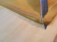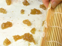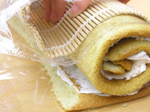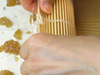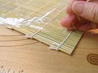 6.あら熱が取れたらすだれの上にラップを広げ、その上に焼き色の付いている面を上にして置きます。手前と向こう側の端っこをそぐように、三角に切り落とします。そして切り落とした生地を芯棒にして巻いていきます。