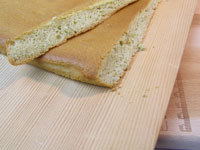 4.敷き紙を敷いた天板に生地を一気に注ぎ入れます。表面をドレッジやスケッパーの平らな側で軽くなで付ける感じで生地の高さを均一にします。(この作業は慣れないとちょっとやりにくいですね)10センチくらいの高さから天板を2回ほど落とし、余分な気泡を抜きます。180度のオーブンで11〜13分焼きましょう。