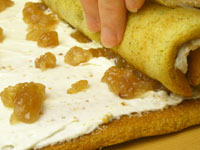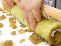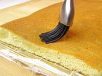7.表面にシロップをたっぷり目に塗ります。プラリネをパラパラと均一に振ります。ホイップした生クリームを平らに広げコロコロに刻んだブロークンマロンたっぷりのせます。切り落とした生地を手前に置きそれを芯棒にして、いよいよのり巻きの要領できっちり巻いていきましょう。巻き終わったらラップでくるみ冷蔵庫で生地をねかせます。