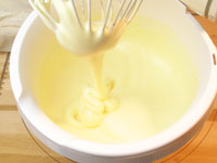 ちょうどピッタリ100CC入る容器を用意して泡立てた卵をその容器にいれます。すりきり一杯を入れて重さを計ります。容器の重さは抜きます。この重さが15グラムから18グラムだと完璧です。100CC入る容器というのは水でいうと100グラムです。同じ容量で重さが15グラムから18グラムということはかなり比重が軽くなっているということです。このくらいまで軽くしておくことが重要です。2 さらにミキシングを続けます。ウイスクで生地をすくい、書いた文字がすぐに消えてしまうようでは泡立てが足りません。ゆっくりと徐々に消えていく感じまで泡立てます。泡立てはここまでです。(このときの比重は0.22〜0.24くらいならOKです)