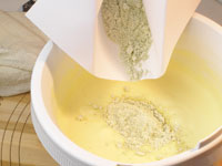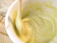 3.穴あき木べらやスパチュラを持って粉合わせをしていきましょう。ふるったスーパーバイオレットと抹茶を入れ、粘らずにでもしっかりと合わせます。木べらやスパチュラは幅のある方の面をしっかりと使い、底の方からスパチュラを大きく使って合わせましょう。まだ少し粉気が残っているくらいの段階で最後に牛乳をスパチュラの面で受けながら加え、全体に馴染ませたらOKです。