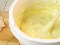 2 さらにミキシングを続けます。ウイスクで生地をすくい、書いた文字がすぐに消えてしまうようでは泡立てが足りません。ゆっくりと徐々に消えていく感じまで泡立てます。マシーンでの泡立てはここまでです。(ボッシュのマシーンで約2分、このときの比重は0.22〜0.24くらいならOKです)マシーンはここまでです。
