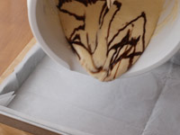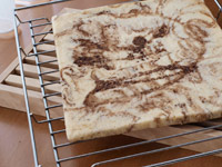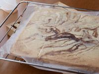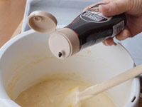 5.最後にハーシーのチョコレートシロップを適量回し入れます。ハーシーチョコレートシロップを回し入れますが、目安としては3周ほど回し入れると良いです。そして一気に型に流し入れましょう。ボウルの中で馴染ませてしまうと、きれいなマーブルに焼き上がりません。敷き紙を敷いた型に生地を一気に注ぎ入れることが大切です。ドレッジのまっすぐな面で生地を平らにします。