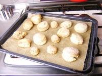 5.天板に並べて、200度のオーブンで11〜12分焼きます。竹串を刺して何も付いてこなければ出来上がりです。うすいきつね色に焼きあがります。マーマレードや生クリームを添えて召し上がってください