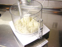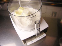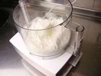 1.クイジナートのワークボールにパン用のはね、ダフブレードをセットします。卵と牛乳以外の材料を入れて、大きめのパン粉状になるまで、2〜3秒ずつ、ダダッ、ダダッという感じで7〜8回ミキシングします。バターのかたまりがまだあちこちに残っている状態です。