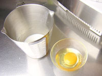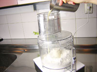 2.牛乳と卵は合わせて、よく溶いておきます。牛乳と卵を合わせた液を加えながら、7〜8秒ミキシング。ここで一度カバーをはずして側面や底についている粉っぽい部分を、スパチュラで落とします。再度、カバーをして7〜8秒こねます。サックリした生地に仕上げるためには、ここであまり、こねすぎない方が良いです。粉気がなくなれば終了です。